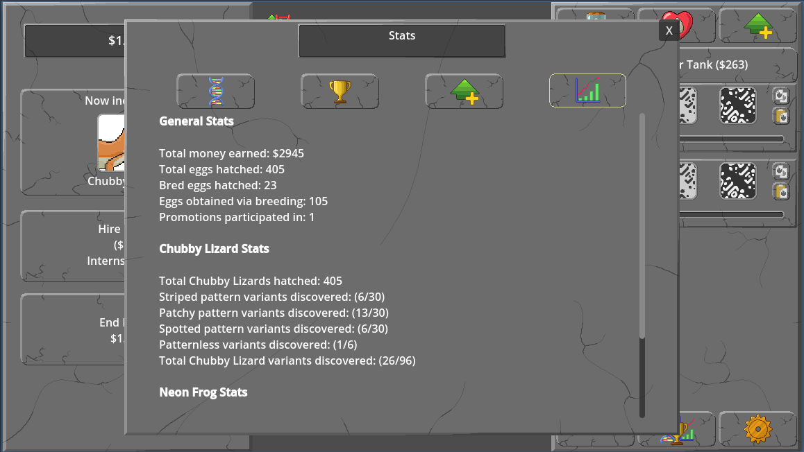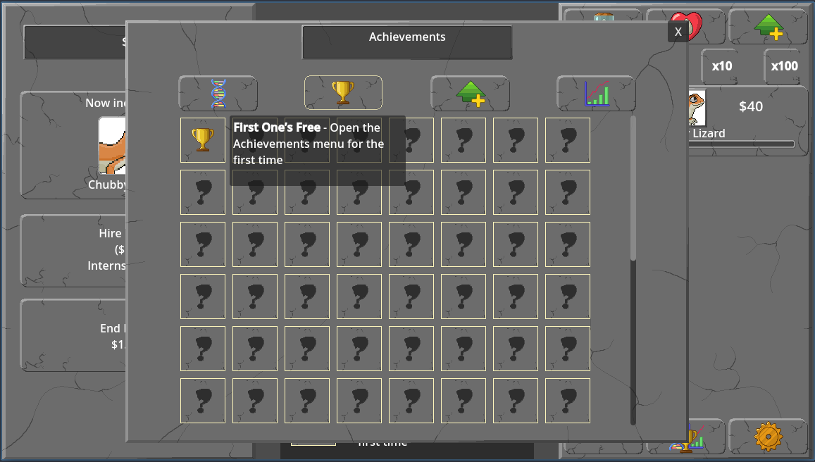 But that's not all that's here. The tabs are all functional, including a readout of your stats, which upgrades you have currently active in the background, and a new feature - achievements.