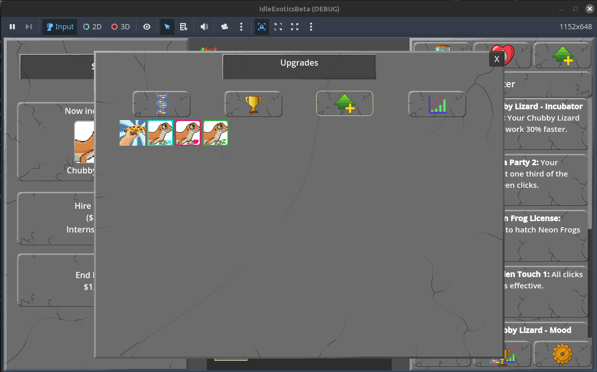 For those who might be a little fed up with seeing the same poorly-drawn placeholder icons for upgrades, I have good news. I've gone through and updated those icons with some of the time I had left over after the code changes were finished. They now have a proper foreground and background, and the backgrounds have even been hooked up with a shader to better control the colors, Adjusting the self_modulate on the sprite just wasn't cutting it anymore. So, I defined some real pallette swaps. You might have also noticed that I re-drew the overlays for the different species. Updates to the individual species icons are on the way, but I think I can afford to procrastinate on that a little while longer, because they look fine for now.