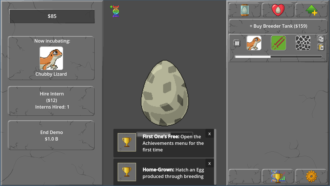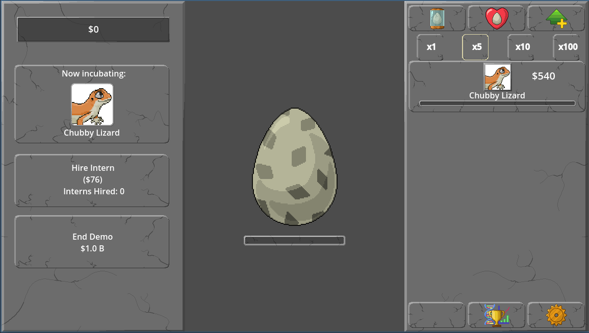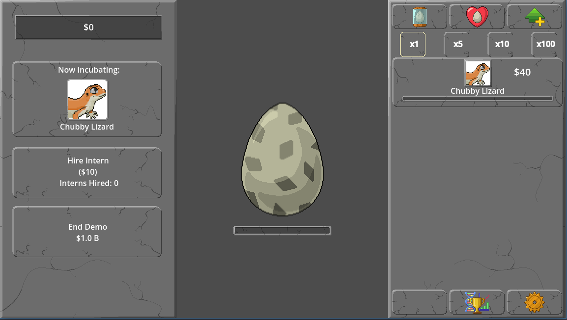 These options will let you buy multiple interns or automatic incubators at a time. This should help for when players reach the stage where they don't have to be monitoring things too closely, and maybe even have it running overnight or while they're away from the game.